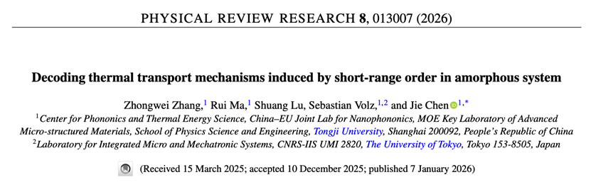 1月7日,同济大学物理学院声子学中心陈杰教授团队在物理类学术期刊《Physical Review Research》发表了题为“Decoding Thermal Transport Mechanisms Induced by Short-Range Order in Amorphous System”的研究论文,深入揭示了非晶固体中短程有序性调控热输运过程的微观物理机制。