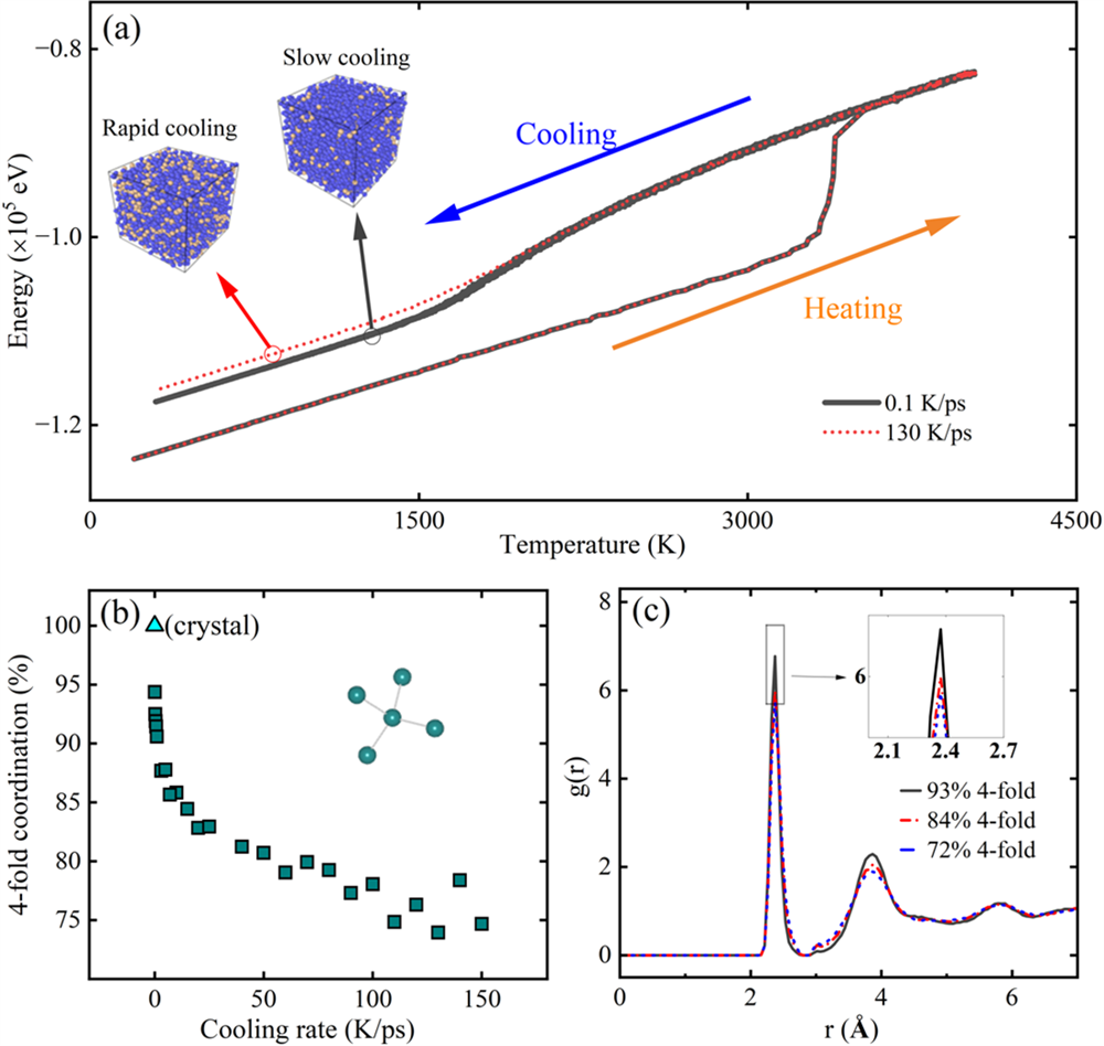 图 1 (a)不同冷却速率下熔化退火过程的示意图,所得非晶结构的四重配位比例分别为93%和72%。子图展示了对应的非晶结构,其中蓝色原子为四重配位,黄色原子为其他配位数。(b)不同冷却速率下形成的非晶结构中四重配位原子的比例。(c)不同四重配位下的结构径向分布函数。