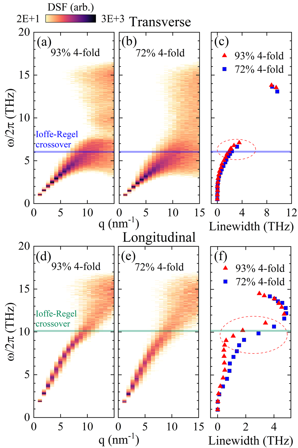 图2 具有不同四重配位比率的非晶结构中动态结构因子(DSF)分析。(a)和(b)对应横向偏振的动态结构因子,(c)为横向偏振的线宽随频率变化的关系。(d) 和(e)对应纵向偏振的动态结构因子,(f)为纵向偏振的线宽随频率变化。(c)和(f)中的线 宽通过拟合(a)、(b)和(d)、(e)中特定波矢的结果得到。图中横线表示93% 四重配位的Ioffe-Regel分界频率,虚线圆圈标出了线宽变化显著的区域。