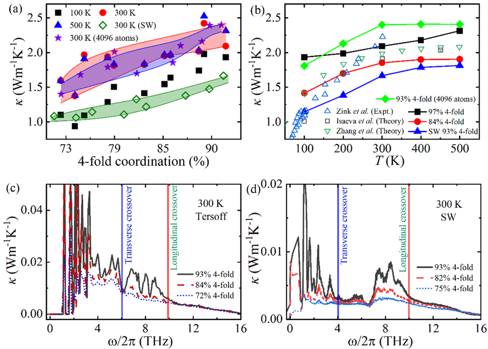 图 3 (a)具有1728 个原子的非晶硅体系热导率κ随四重配位比例的变化,分别使用 Tersoff 势(实心符号)和 SW 势(空心菱形)的计算结果。星形符号表示在300 K下,采用 Tersoff 势对具有4096 个原子的非晶硅体系的计算结果。(b)非晶硅体系热导率κ随温度的变化。(c)和(d)分别展示了室温情况下采用Tersoff势和SW势计算得到的非晶硅体系频谱热导率κ。图中竖线表示不同极化方向的Ioffe-Regel截止频率。