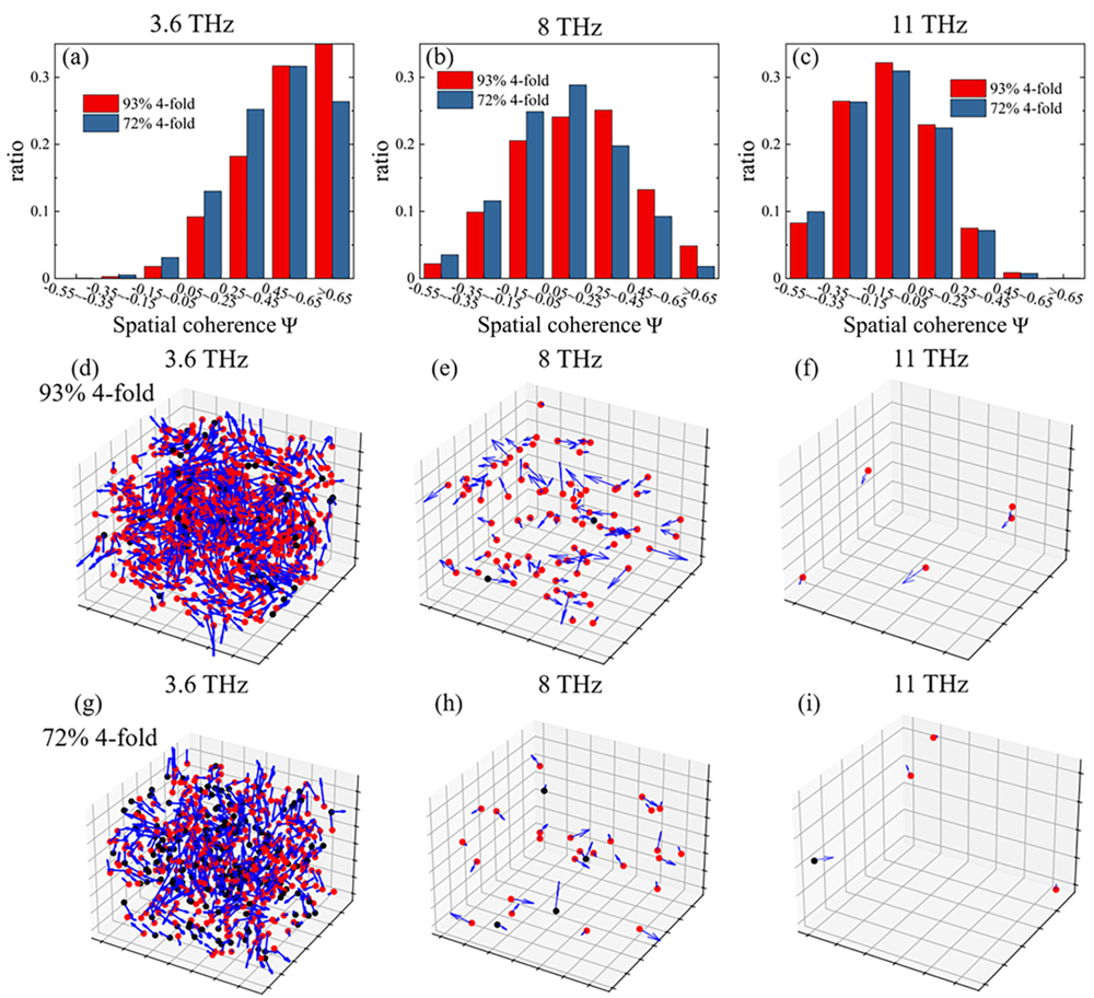 其中,ei(μ)代表模式μ 在原子i上的本征矢量。Ψi 取值越接近1,代表模式的波动性越强。图 4(a-c)分别展示了频率为3.6 THz,8 THz和11 THz的振动模式(分别对应于传播子、混合模式和扩散子),在四重配位比率为93%和72%的非晶结构中空间相干性分布比较。当频率从3.6 THz增加到11 THz,空间相干性明显降低,表现在Ψi