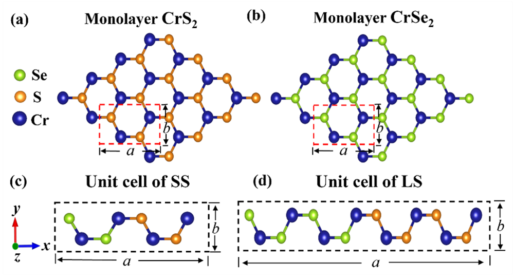 图1. 单层(a) CrS2和(b) CrSe2的俯视图。(a)和(b)中的红色虚线表示用于构建横向超晶格的正交晶胞。(c)和(d)分别为短周期(SS)与长周期(LS) CrS2/CrSe2超晶格的晶胞。黑色虚线标出了各超晶格的重复单元。Cr、S和Se原子分别以蓝色、橙色和绿色球表示。