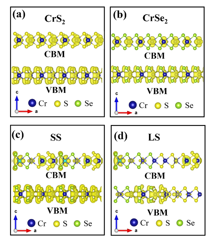 图3.(a)CrS2、(b)CrSe2、(c)SS和(d)LS的导带底(CBM,上排)与价带顶(VBM,下排)的电荷密度分布。原子结构以沿b轴方向的侧视图展示。Cr、S和Se原子分别以蓝色、黄色和绿色球表示。